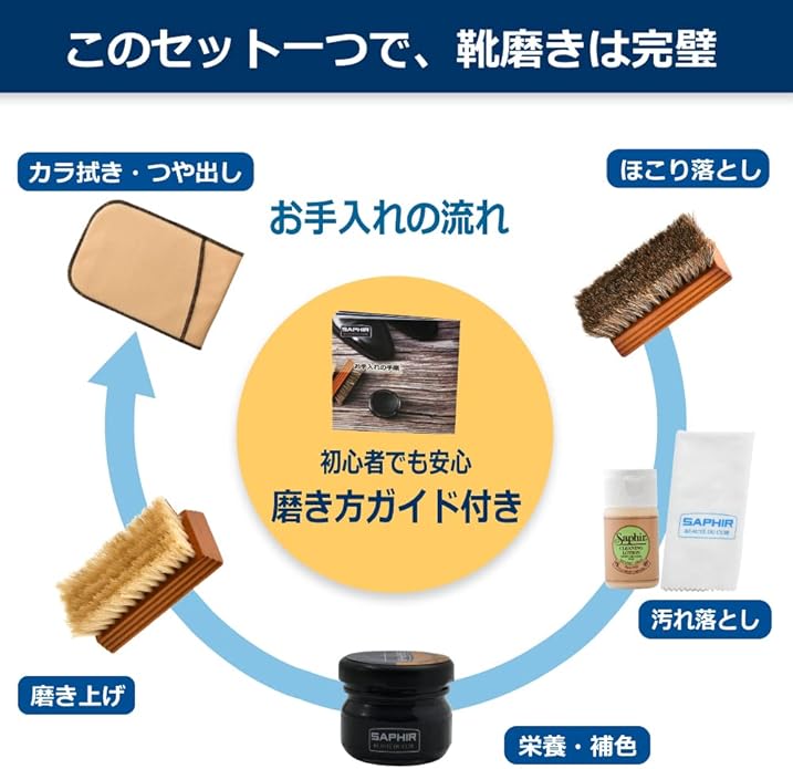 [サフィール] 靴クリーム シューケア スターター セット シングルミニ(PA-SANNH) 革靴 手入れ セット メンテナンス 靴クリーム 馬毛 豚毛 ブラシ クロス 初心者 高級 着色 補色 キズ隠しビギナー用