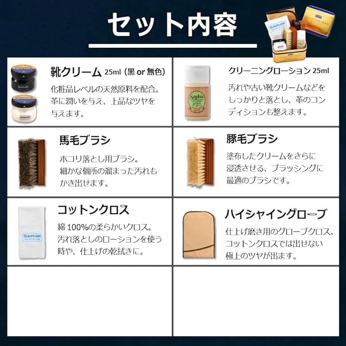 ●保革/栄養効果の高い靴用クリームと革にやさしいクリーナー、ブラシ、クロスなどをオリジナルの缶に詰め込んで、すぐに靴磨きが始められます。
