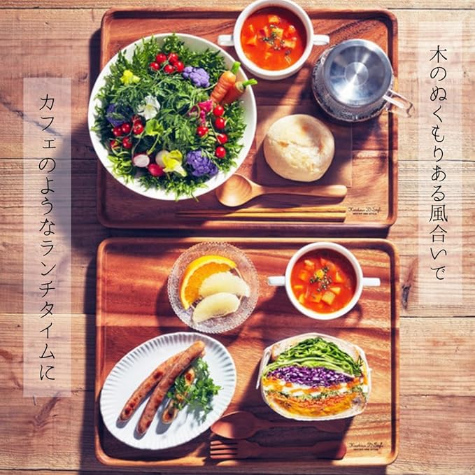 毎日の食事や軽食シーンで使いやすい実用性の高い定番の木製トレー。プレートやボウル、カップをまとめて載せられるサイズ感で、配膳や後片付けをスムーズに行えます。 シンプルで主張しすぎないデザインのため、和食・洋食どちらの食器とも相性が良く、朝食・ランチ・ティータイムまで幅広く活躍します。軽くて扱いやすく、日常使いで出番が多いのも特長。