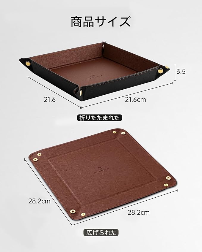 VLANDO レザートレイ 折り畳み式 小物入れ 正方形 アクセサリー収納 腕時計 鍵 スマホ メガネ 男性 玄関 カフェ プレゼント (L-ブラウン)