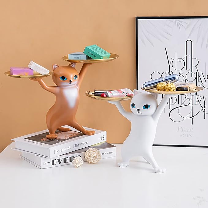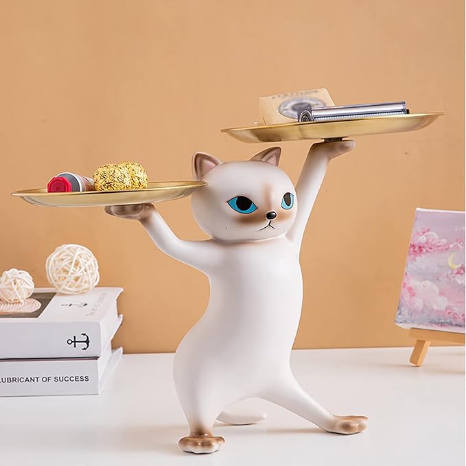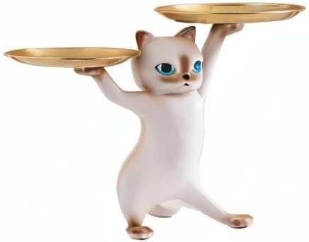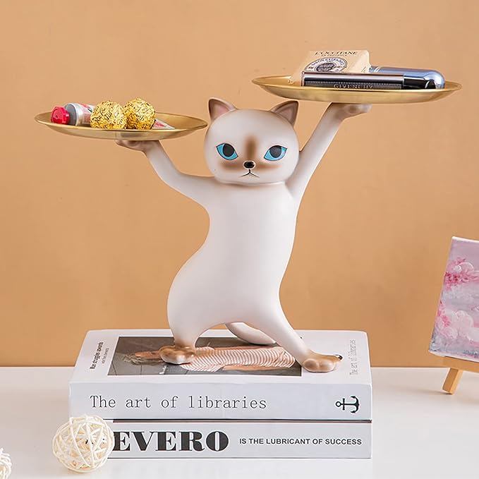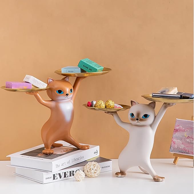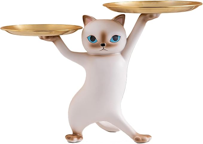 玄関 収納 皿を捧げる猫 鍵置き トレー キーボックス 玄関 収納 小物 財布 口紅の収納 樹脂置物(グレー)