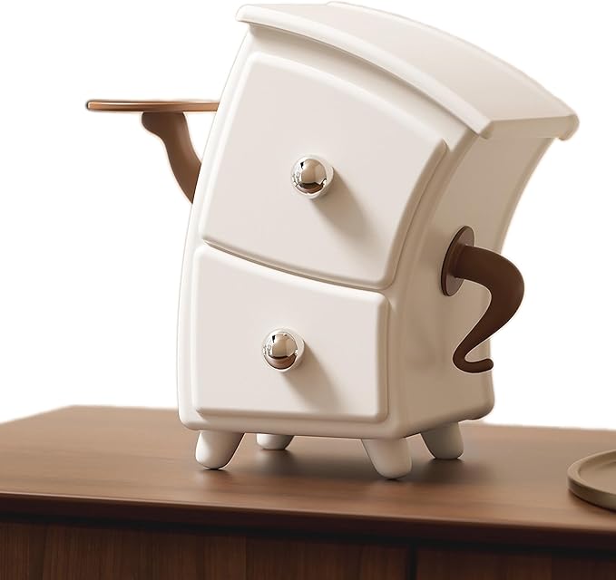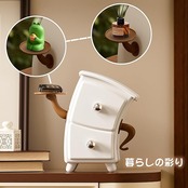 どこにでもある無機質な収納箱とは違います。片側が差し出されたトレー、もう片側が腰に手をあてたようなポーズは、どこか人間味のある愛嬌を感じさせ、空間に温かみと独特のストーリー性を生み出します