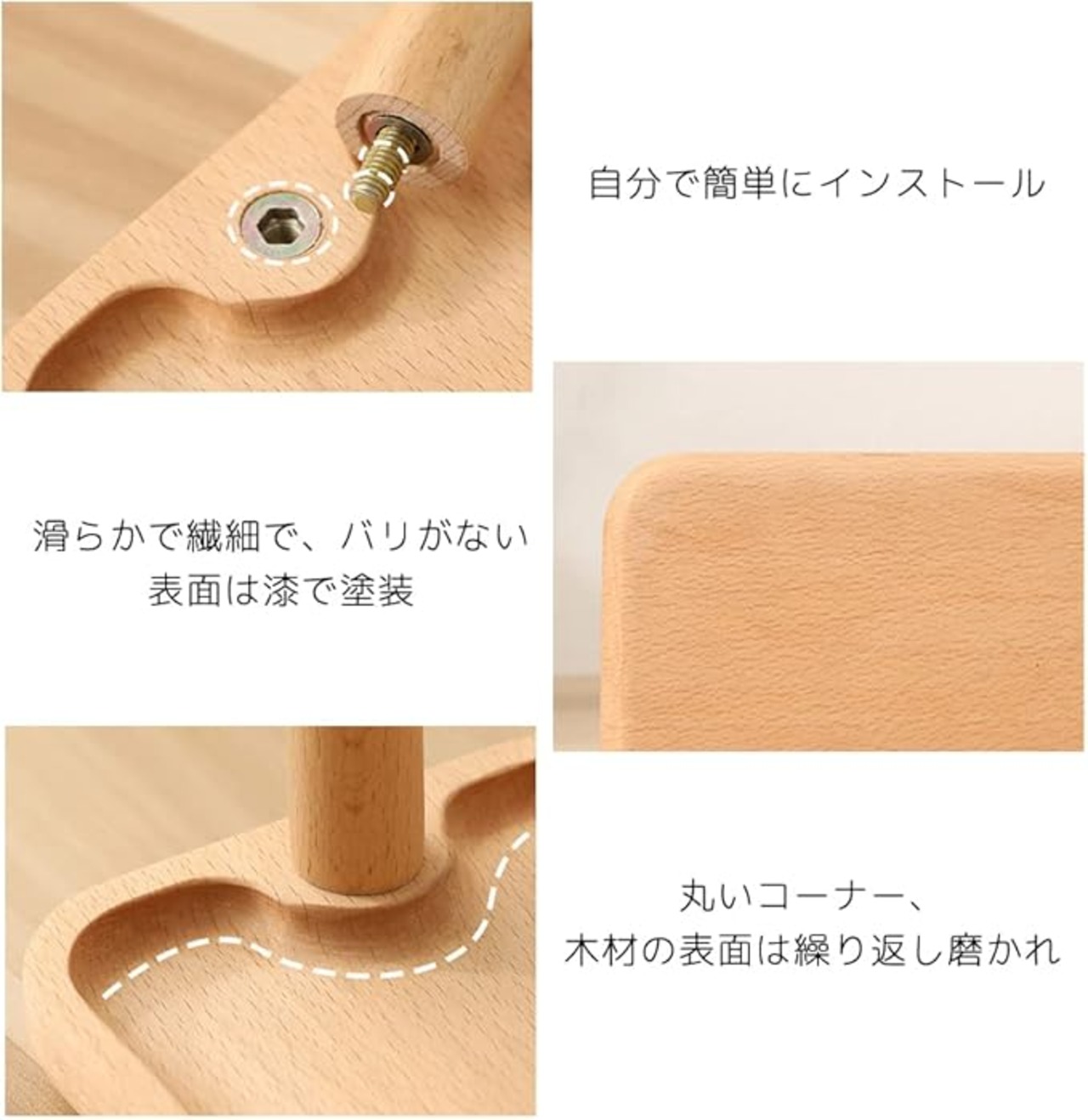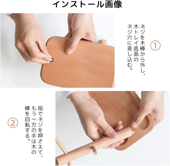 ●インストール:方法①1.ネジを木棒から外し、木トレイ底面のネジ穴に差し込む。2回転する時指でネジを押さえて、もう一方の手は木の棒を回転する。(もし締め付けていない場合は、ドライバーで締付ける)。方法②手で木棒を握って、直接トレイ底面のネジ穴に合わせて回転して締付ける。