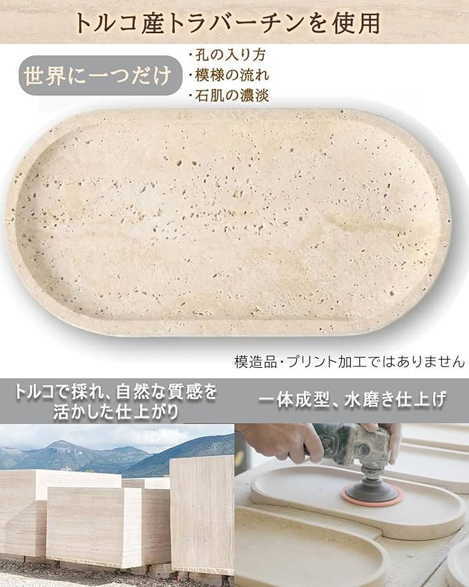 ✅【天然石ならではの個性について】本製品は天然トラバーチン(天然大理石)を使用しています。素材の特性上、表面に自然由来の小さな孔(あな)が見られる場合があります。これは人工素材にはない、天然石ならではの個性です。一つひとつ異なる表情をお楽しみください。