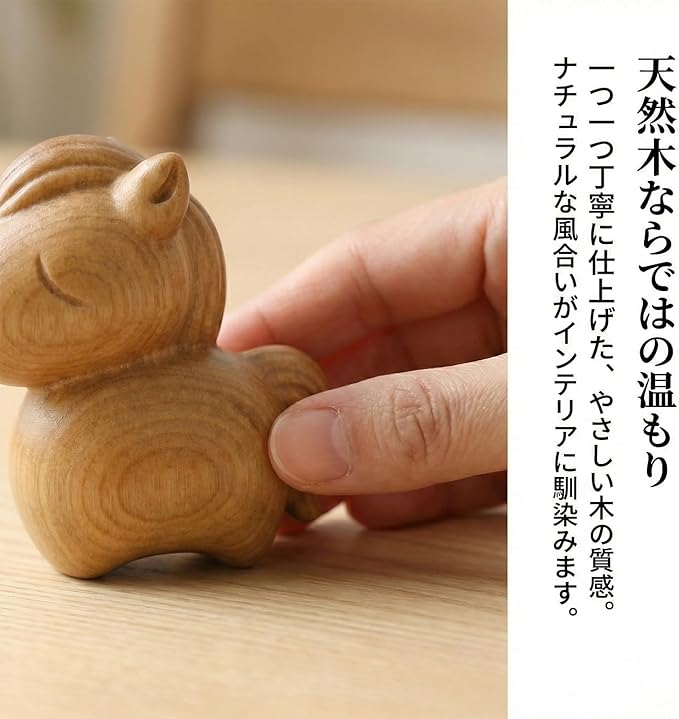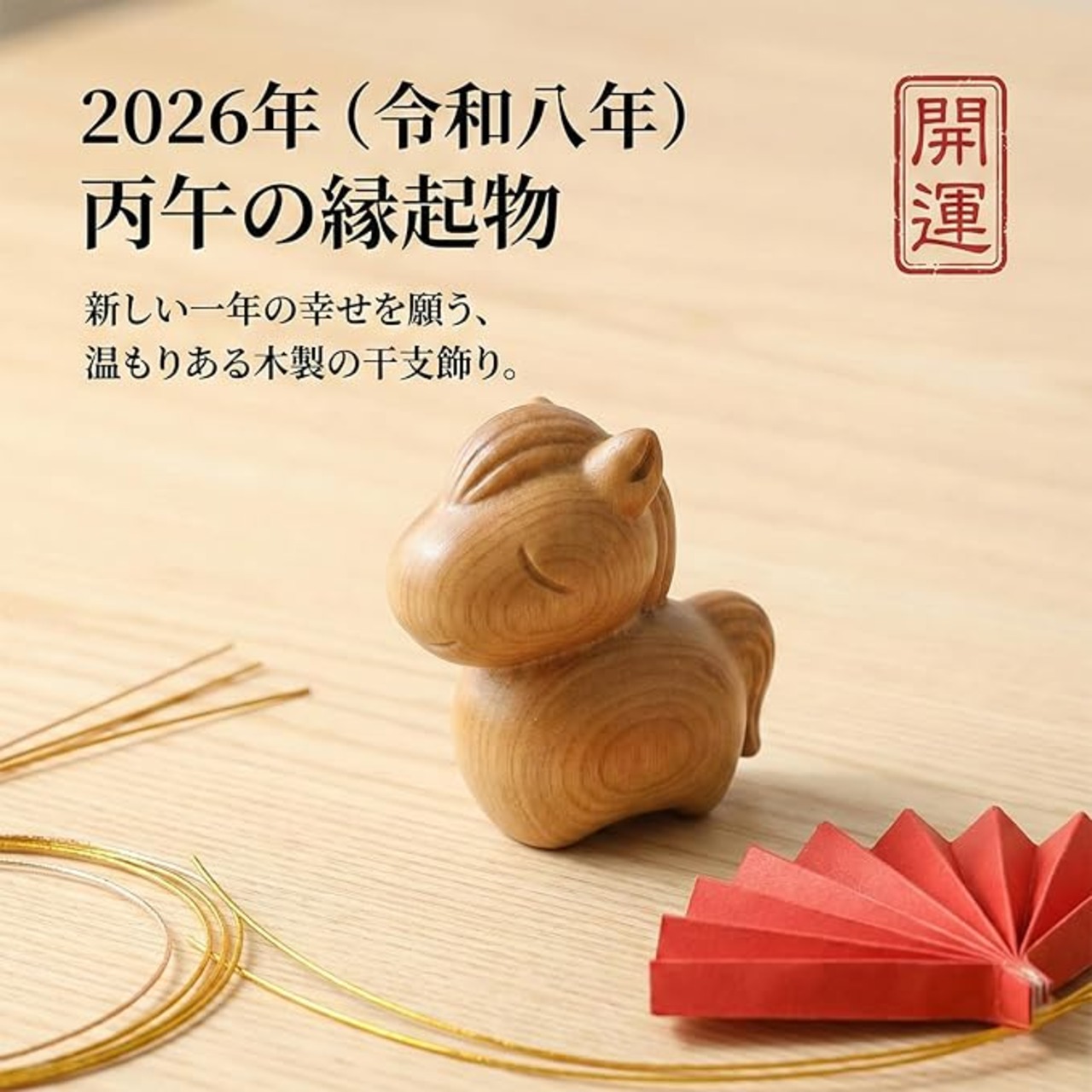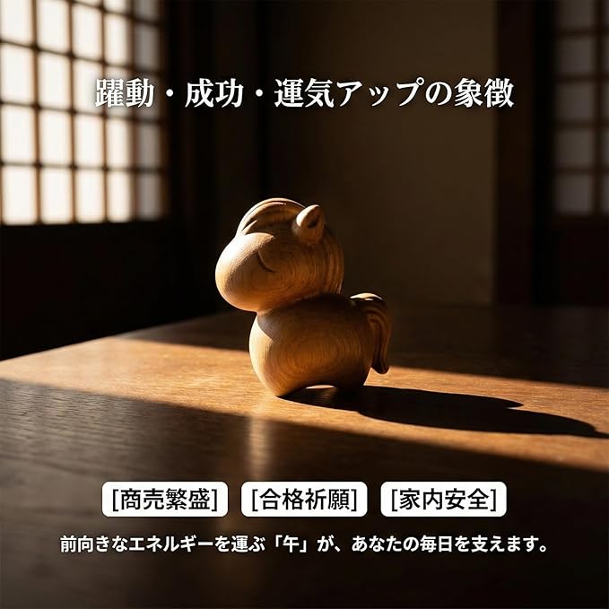 2026年 午年の干支置物:2026年(令和8年・丙午)にふさわしい、可愛らしい木製の馬の置物。新年のスタートに縁起の良い干支飾りとしておすすめ。