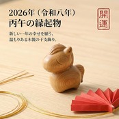 2026年の干支「午(うま)」をモチーフにした、木製の小さな馬の置物です。天然木のあたたかみを感じるシンプルなデザインで、お正月飾りとしてはもちろん、普段のインテリア小物としても使いやすいのが特徴です。 馬は古くから躍動・成功・発展を象徴する縁起の良い存在とされ、商売繁盛や勝負運、合格祈願のお守りとして親しまれてきました。丙午の年にふさわしい、前向きでエネルギーを感じさせる干支置物です。 玄関やリビング、書斎、オフィスの受付など、場所を選ばず飾れるコンパクトサイズ。新年の迎春飾りとして、大切な人への贈り物としてもおすすめです。